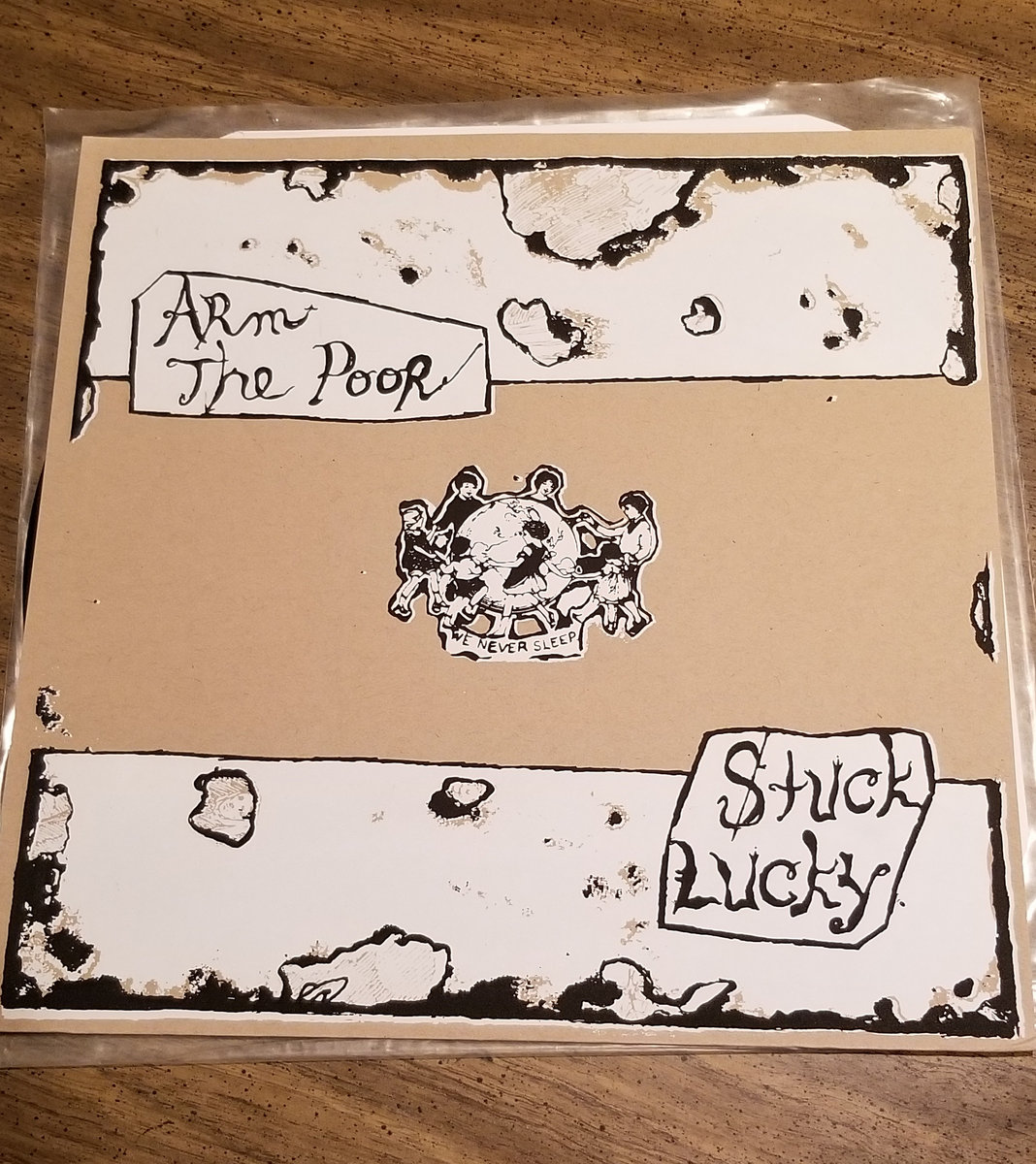 The vinyl version of "We Never Sleep", which includes a screen printed sleeve, all of Arm The Poor's tracks, plus a few audio mysteries of our own that we didn't include for download.